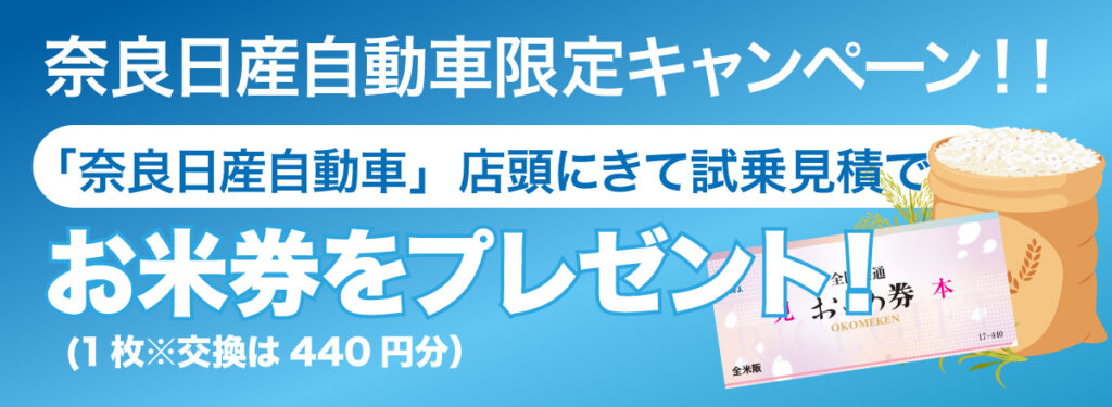 | 賞品内容 奈良日産自動車店舗にて「残価設定型クレジット」での新車ご購入で使える契約月数×2,000円(最大12万円) 対象条件 奈良日産自動車店舗にて、7月13日までに残価設定型クレジットプランでご成約いただいたお客様が対象となります。 ご購入対象車種 日産アリア、日産リーフ、日産サクラ、ノート オーラ、ノート、エクストレイル、キックス、セレナ、ルークス、デイズ、クリッパーリオ、エルグランド、キャラバン、NV200バネット、フェアレディZ、スカイライン |
